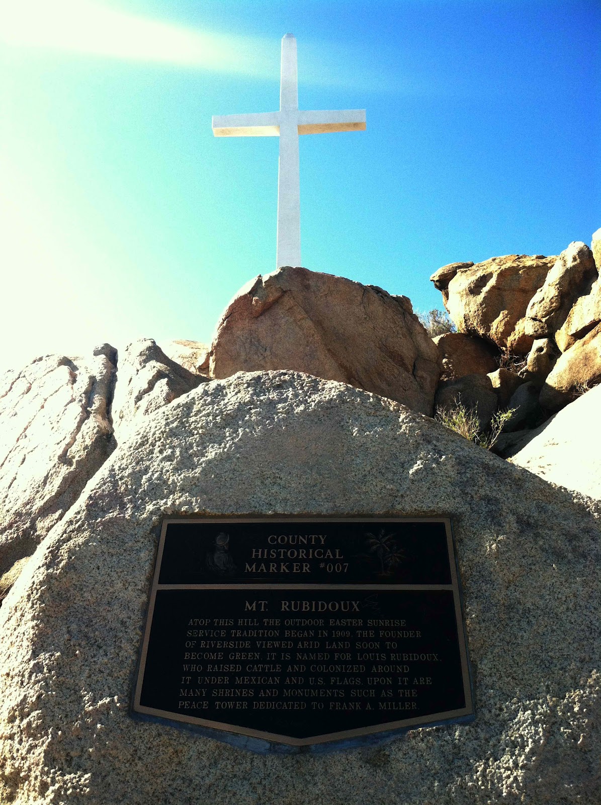Mt. Rubidoux Atop this hill the outdoor Easter sunrise service tradition began in 1909. The founder of Riverside viewed arid land soon to become green. It is named for Louis Rubidoux, who raised cattle ande colonized around it under Mexican and U.S. flags. Upon it are many shrines and monuments such as the Peace Tower dedicated to Frank A. Miller |