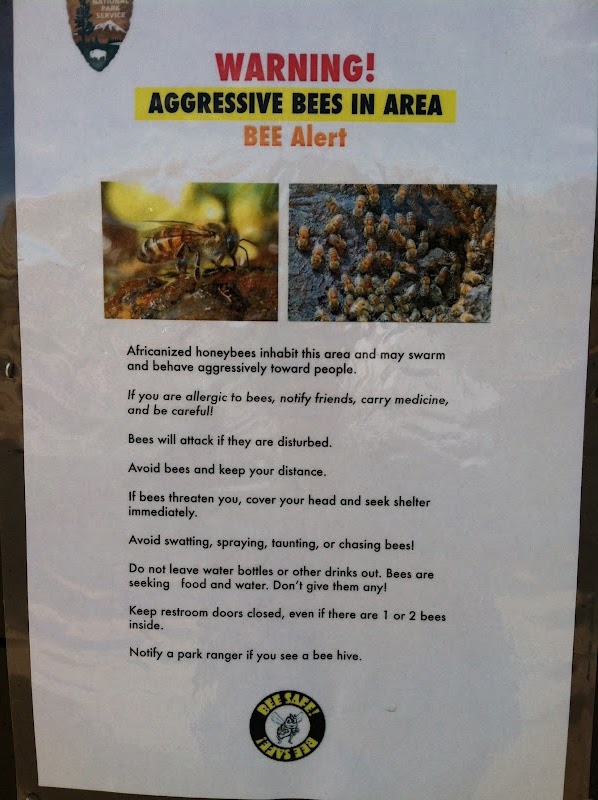 Oh, I almost forgot to mention, one of the first things we saw when we got to the park was this poster about the killer bees in the area. Fortunately we did not see any.