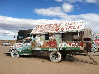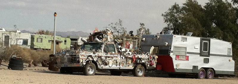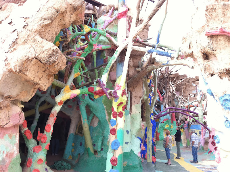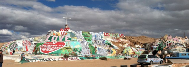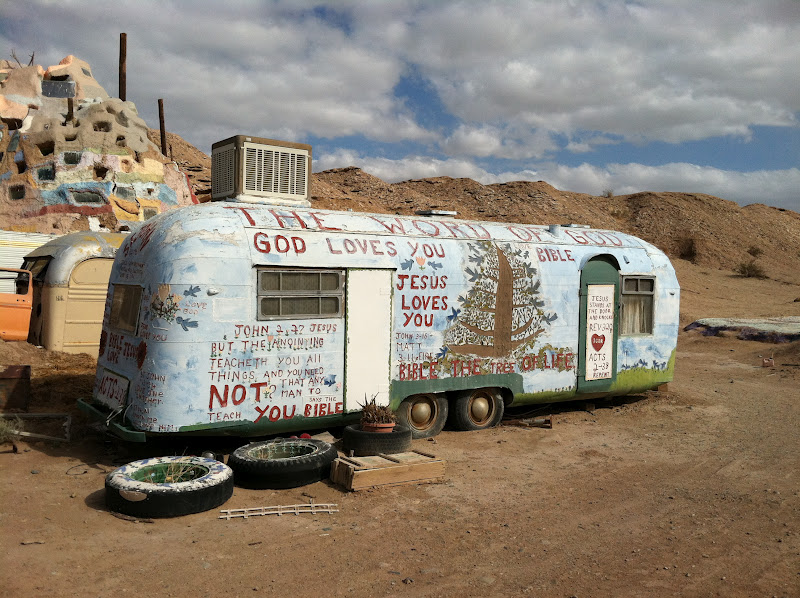Down in the desert, not in the park, near the Salton Sea, a man by the name of Leonard Knight, who discovered God after a life-altering event in 1967, created Salvation Mountain. He has been building and painting on this since 1985, and just recently moved into a care facility. Up until now he had been living in his painted-up truck here at Salvation Mountain. We had to go see it. Very interesting.