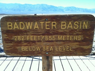 Badwater Basin, 282 feet below sea level. Death Valley is one of the hottest places on earth, often reaching daytime temps of 120F/49C and night times and many nights don’t drop below 100F/38C. It’s also the driest place in North America, getting less than two inches of rainfall a year.