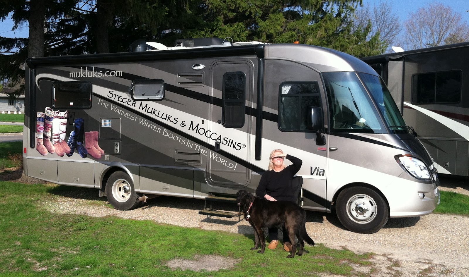 While we were waiting for our rig we met and had a nice visit with Patty Steger, the owner of Steger Mukluks & Moccasins in Ely, Minnesota. She had a new RV all painted up with graphics from her company. She was traveling with her big sweetheart of a dog, Luke.