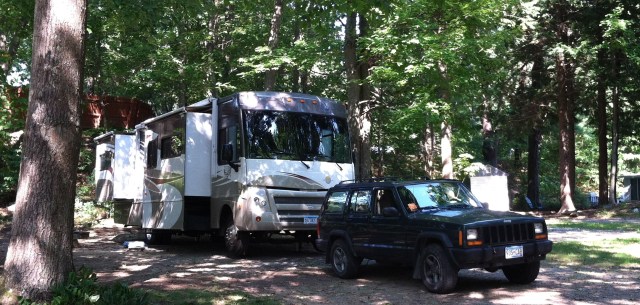 This is where we are now, in an RV park that has two names: Wild Acres Resort and Virginia Park Resort. Two resorts that merged last year. It’s a very wooded resort/park and includes park models, RV sites, and tent sites. We were able to stay here for half price using our Passport America membership discount, but they limit that price for one night only. We’ll decide tomorrow if we will stay another day or not.