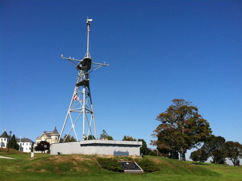 Our first stop today was at Fort Allen Park. We were here before, but came for another look. There are great views of Portland and the harbor here. This is where we took the pictures of the cruise ship and the sailboat school the other day. There is a memorial to the USS Portland, one of the most decorated ships of World War II. Here is the top of the mast, the bridge sheet and the bell from that ship from when it was decommissioned. There are other memorials here too, including a 9/11 memorial.