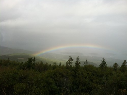 It looked like it was going to be another beautiful day after all. So, we decided to take a trolley tour of Bar Harbor and Acadia National Park. The tour included a trip to Mt. Cadillac. We were excited to see some spectacular views from up there. As we were going up I could catch glimpses of amazing scenery. And when I stepped off the trolley I could see the fog was rolling in. It arrived so quickly, by the time I walked down the sidewalk to the viewing area it was completely gone! Just that fast! And then an apologetic rainbow appeared.