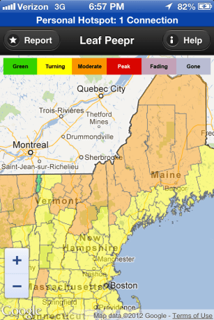 It never occurred to me before to look for an app on my Iphone but today I found one.  It’s called Leaf Peepr and it allows users to send in ratings to update the peak leaf viewing areas on a map.  The area we are in is in the “moderate” area right now.