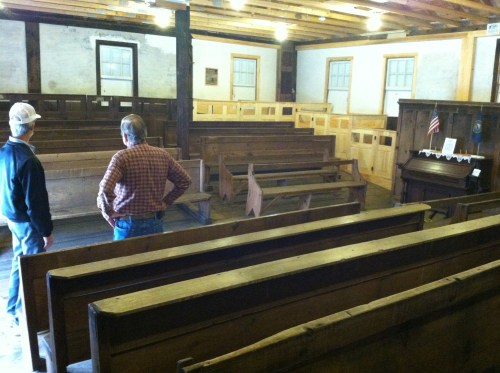 This building is unusual because it has sloping floors toward the center of the room and original pew holder’s names have been preserved.
