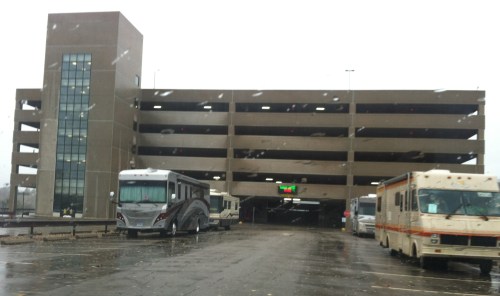 We slept well in the RV overnight. Since the storm was supposed to start getting bad we took our valuables and blankets and pillows drove the Jeep to one of the parking ramps at the casino. We’ve been hanging out inside the casino for most of the day. We went to the Monday 2-for-1 buffet for breakfast and just stayed there through lunch! What a deal 🙂 Then we just walked around the casino. There are no windows to the outside and we can’t hear anything over the noise of the slot machines and music playing.