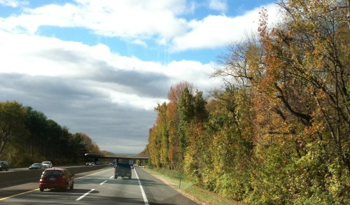 There was some road construction, but nothing that slowed us down. Most of what we drove today was tree-lined. The sun was out for a while and we could see some nice fall coloring at times.