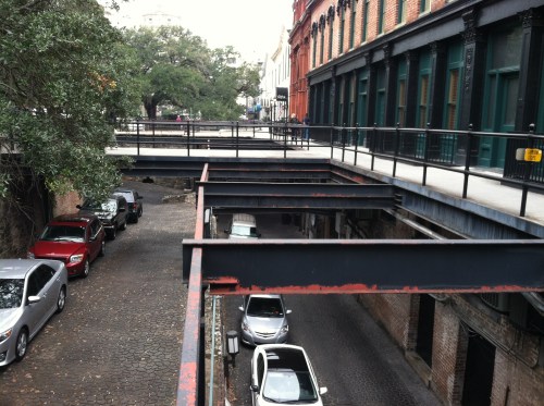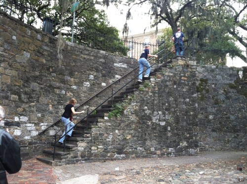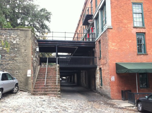 In the early 19th century cotton was one of the nation’s major exports and Savannah was the busiest seaport on the Atlantic and second in the world.  The old buildings were warehouses on a 40′ bluff.  That’s why you have to climb steps to get back up to the street level.  Back in the cotton exchange days the men who “factored” how much cotton came in worked on these walkways and bridges.  The wagons would come through the lower level and the Factor’s would look down and see the load from above.  The shopkeepers park their cars there now.  I know it looks like a scary place, but it’s really safe to walk there.  The scary part is walking on those old cobblestone streets without twisting your ankle!
