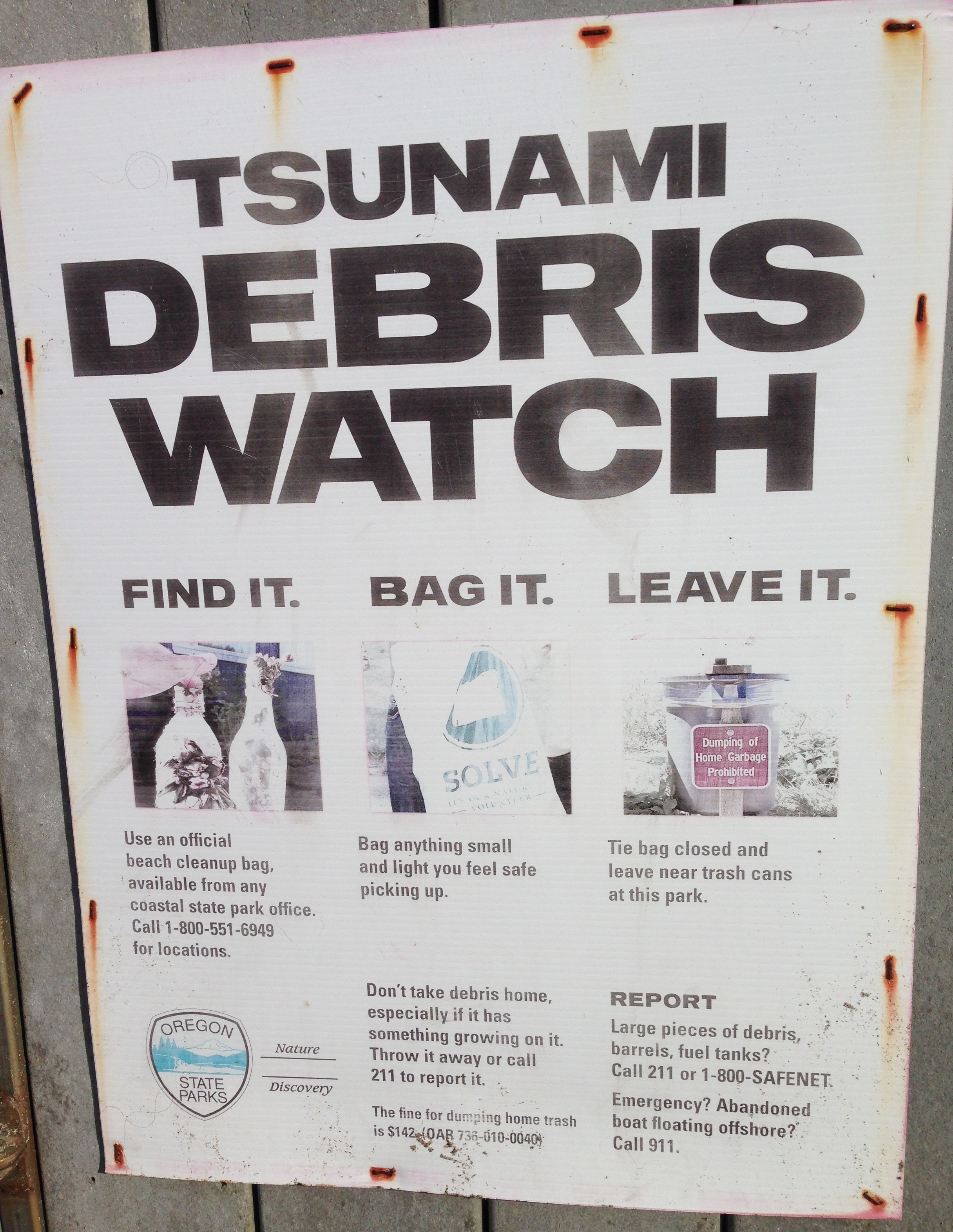 Yesterday we drove north on the Pacific Highway 101 so today we explored south. We saw this Tsunami Debris Watch sign with instructions what to do with debris that you find washed up on the beach. Bag it up and leave near the trash cans, but don’t take it home.