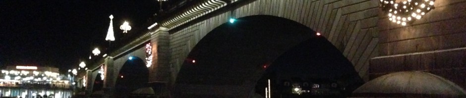 The sun was getting low and we knew that tonight was the city’s Christmas Lighting Ceremony so we hung around for a few hours to see what they did. The first thing is a swimming race across the channel along side the London Bridge. There were 56 swimmers and whoever reached the other side first got the flip the big switch that turned on all the Christmas lights. Swimmers ranged in age from 7 years old to 60. There were a few who could not make the distance, they were given a ride on a foam mat. We watched from atop the bridge.