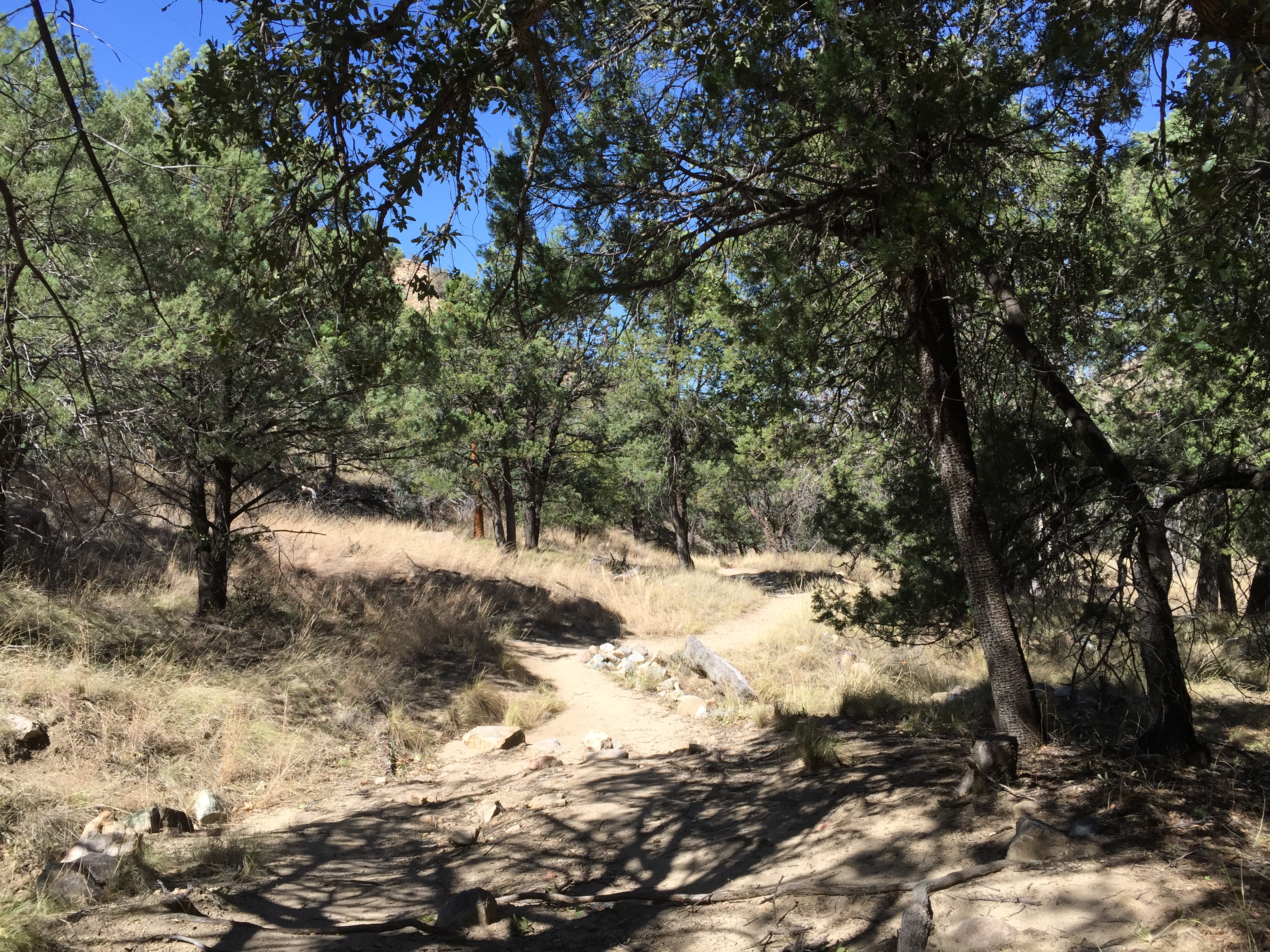 When it gets up over 80 we just cannot stay inside the RV without the air-conditioner running. But since we’re not hooked up to electricity that’s hard to do. We decided to drive down to Madera Canyon, south of where we are. It was cooler there. It’s within the Coronado National Forest in the Santa Rita Mountains. Bernie’s feeling better so we went for a short hike in the trees along side a babbling brook.