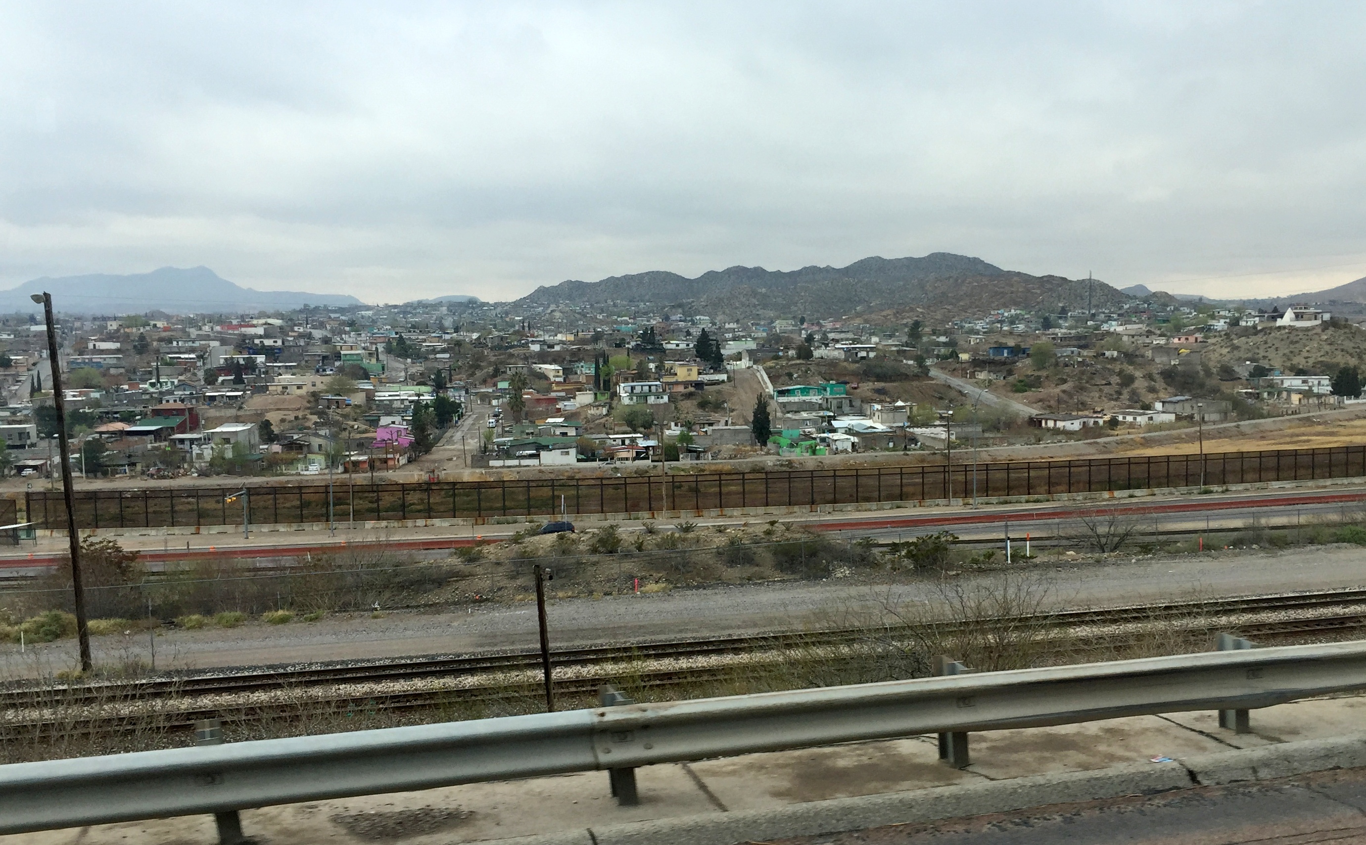 We are, more or less, for the time being, following parallel to the Amtrak train trip we just took. You can see the train tracks below the highway and then the Mexico border fence, and Juarez, Mexico on the other side.