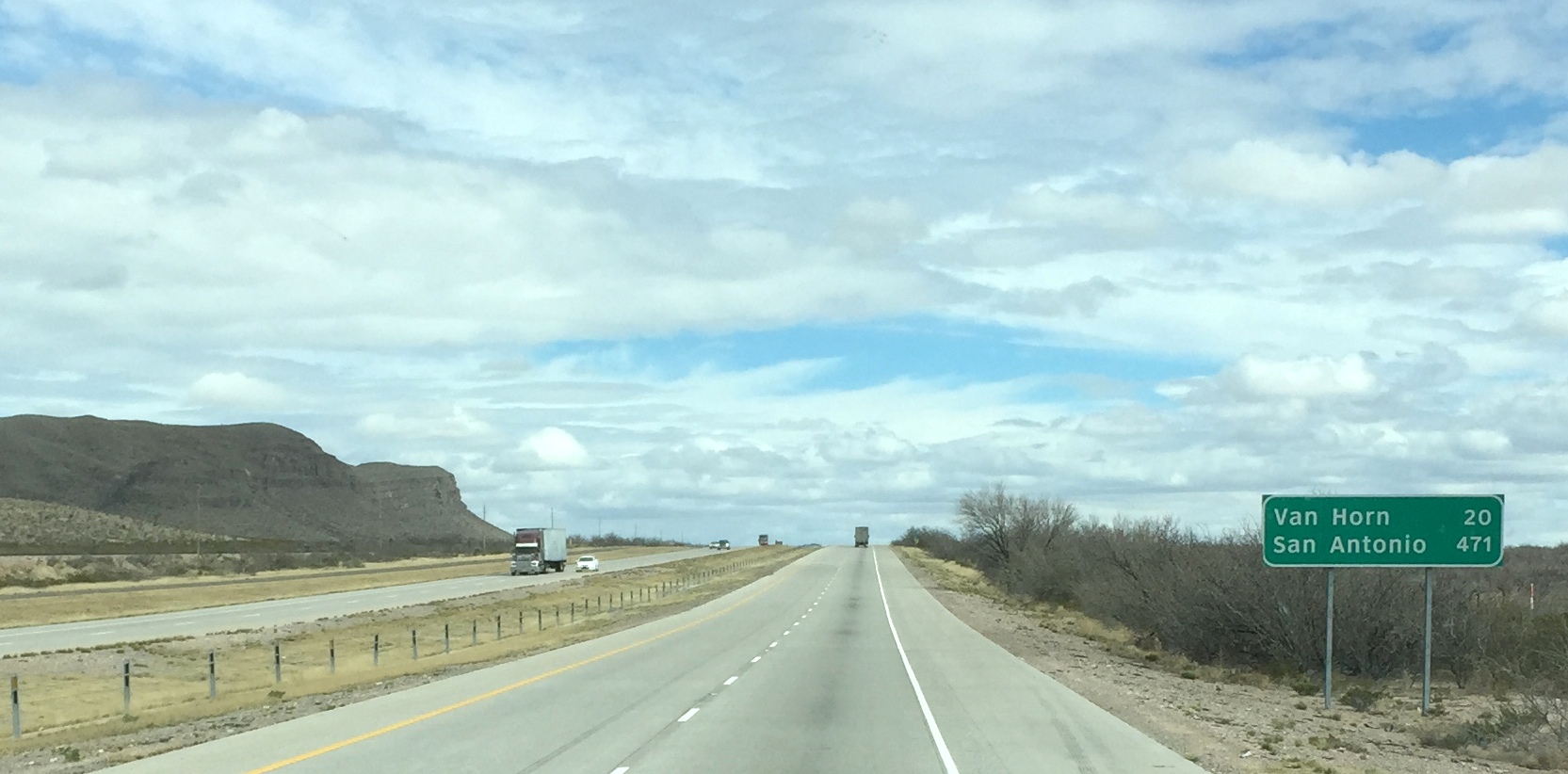 Texas is a big state. 800 miles across. From this point it is 411 miles to San Antonio. Here we go….