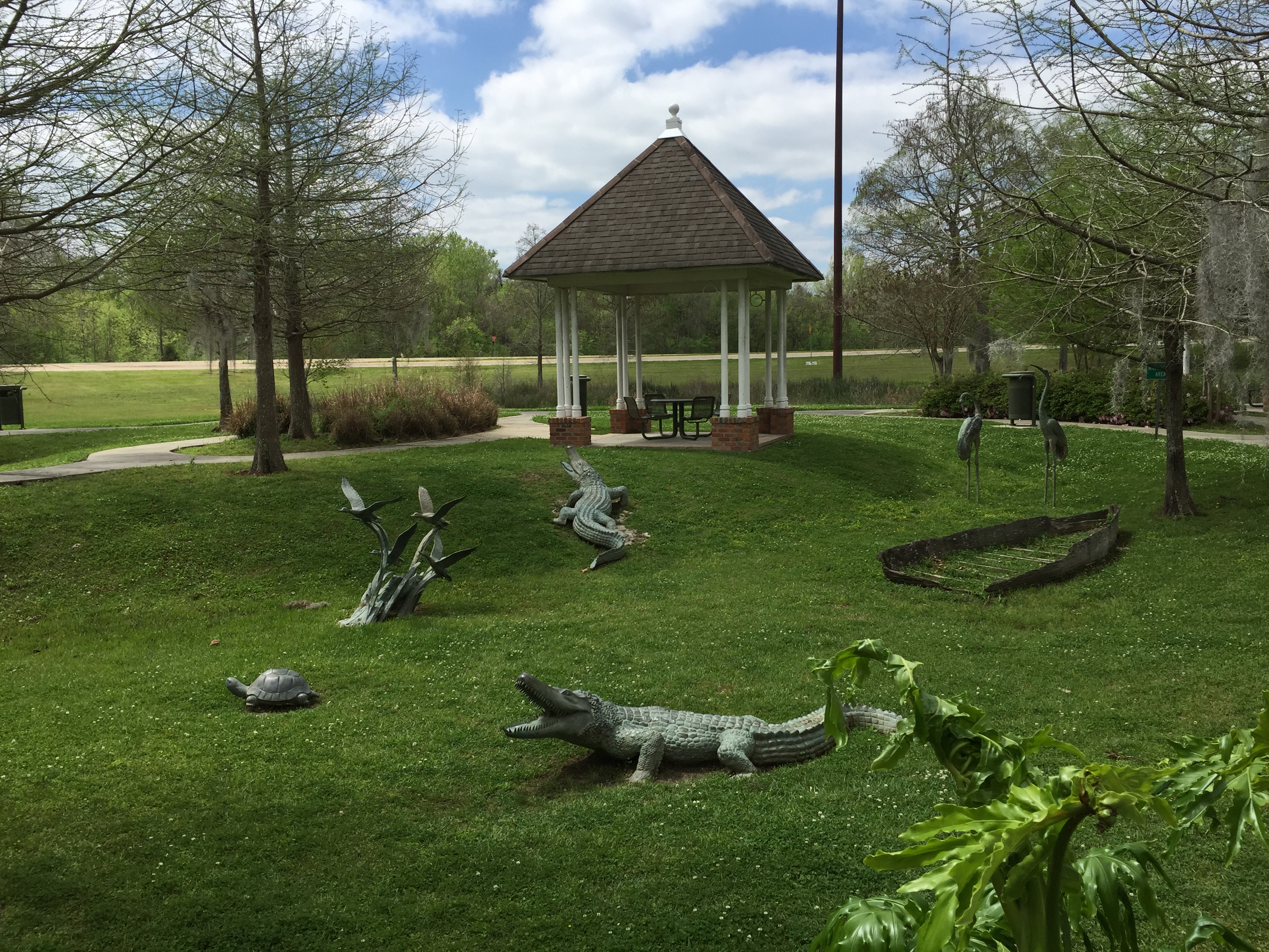 It was a very noisy night spent in the parking lot at Isle of Capri Casino last night between the highway bridge noises and the trains going by. Neither of us slept well. So we’re tired today and only drove 125 miles. Today we’ve been seeing the rice fields. This is the area where we saw them when we were riding the Amtrak train earlier. Besides rice going in the flooded fields there are cages to capture the crawfish they grow there too. Double duty.