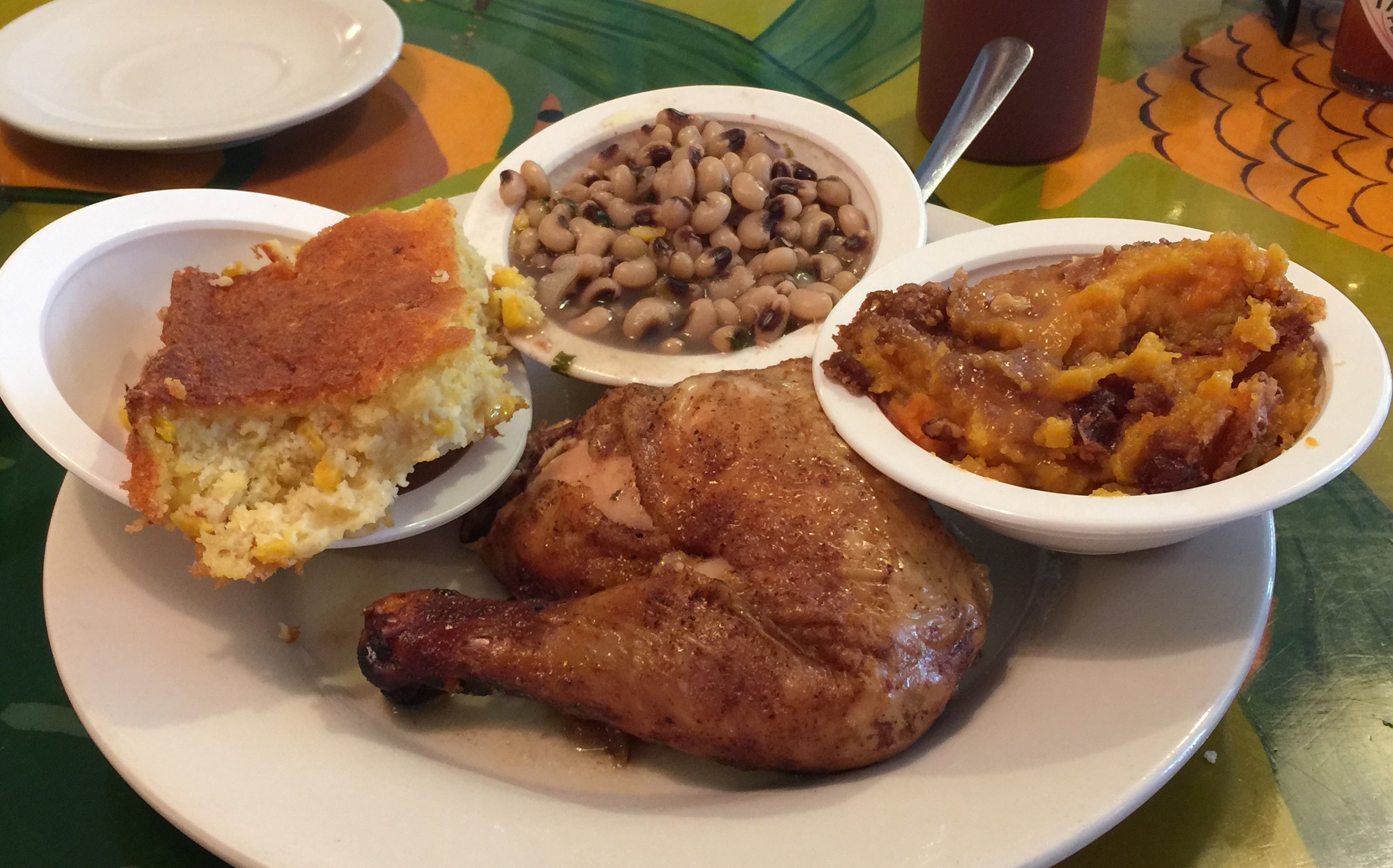Rotisserie smoked chicken, corn bread, sweet potato casserole and black-eyed peas.