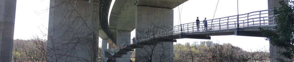 The weather today is much nicer than it was yesterday. It’s sunny, blue skies, and about 60 degrees, slight breeze. We walked the canal walk and along the river until we came to this pedestrian bridge that is suspended from the Robert E Lee bridge on Highway 301. It goes across the river over to the popular Belle Island with its wooded hiking trails and rocks to climb around on.