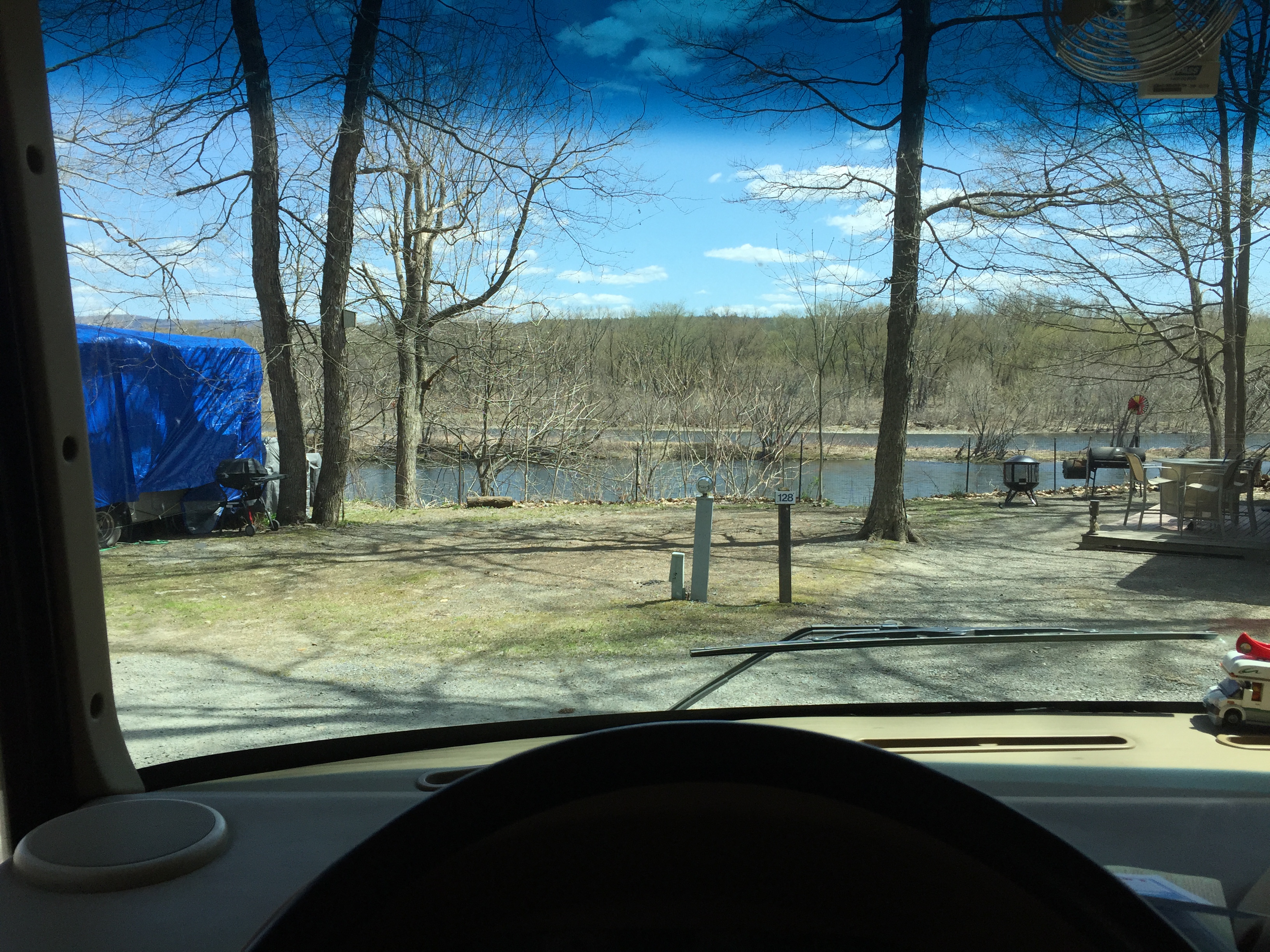 We are now at River Beach Campsites in Milford. We were here last year but it was pouring rain at that time so we didn’t see much of it. The view from our rig is of the Delaware River.