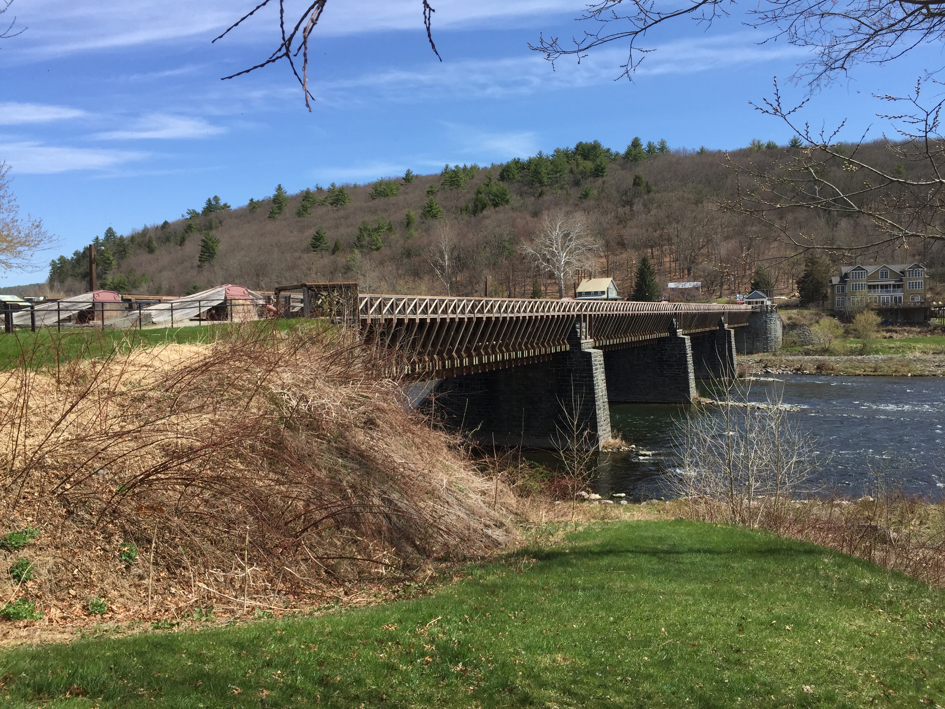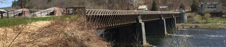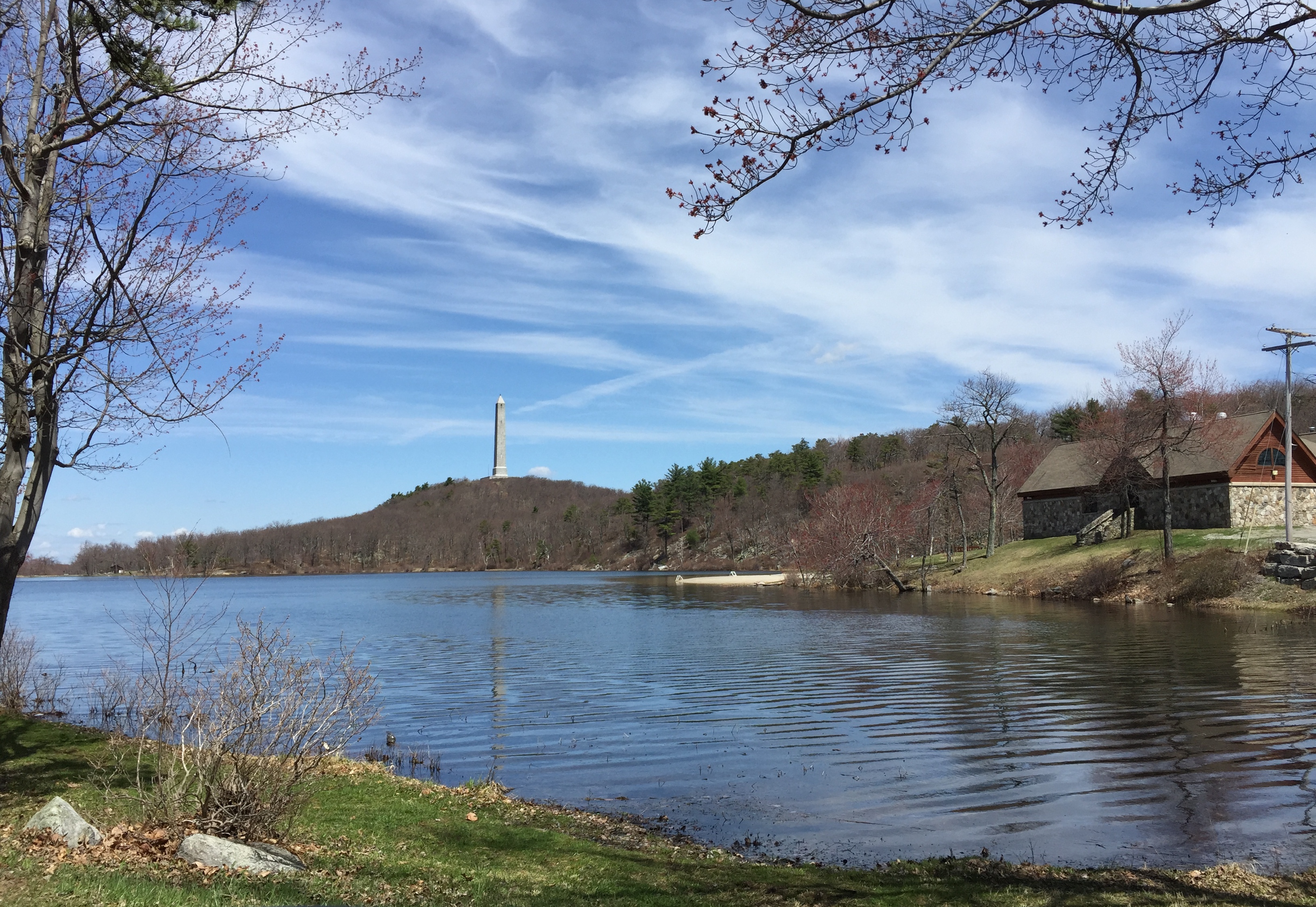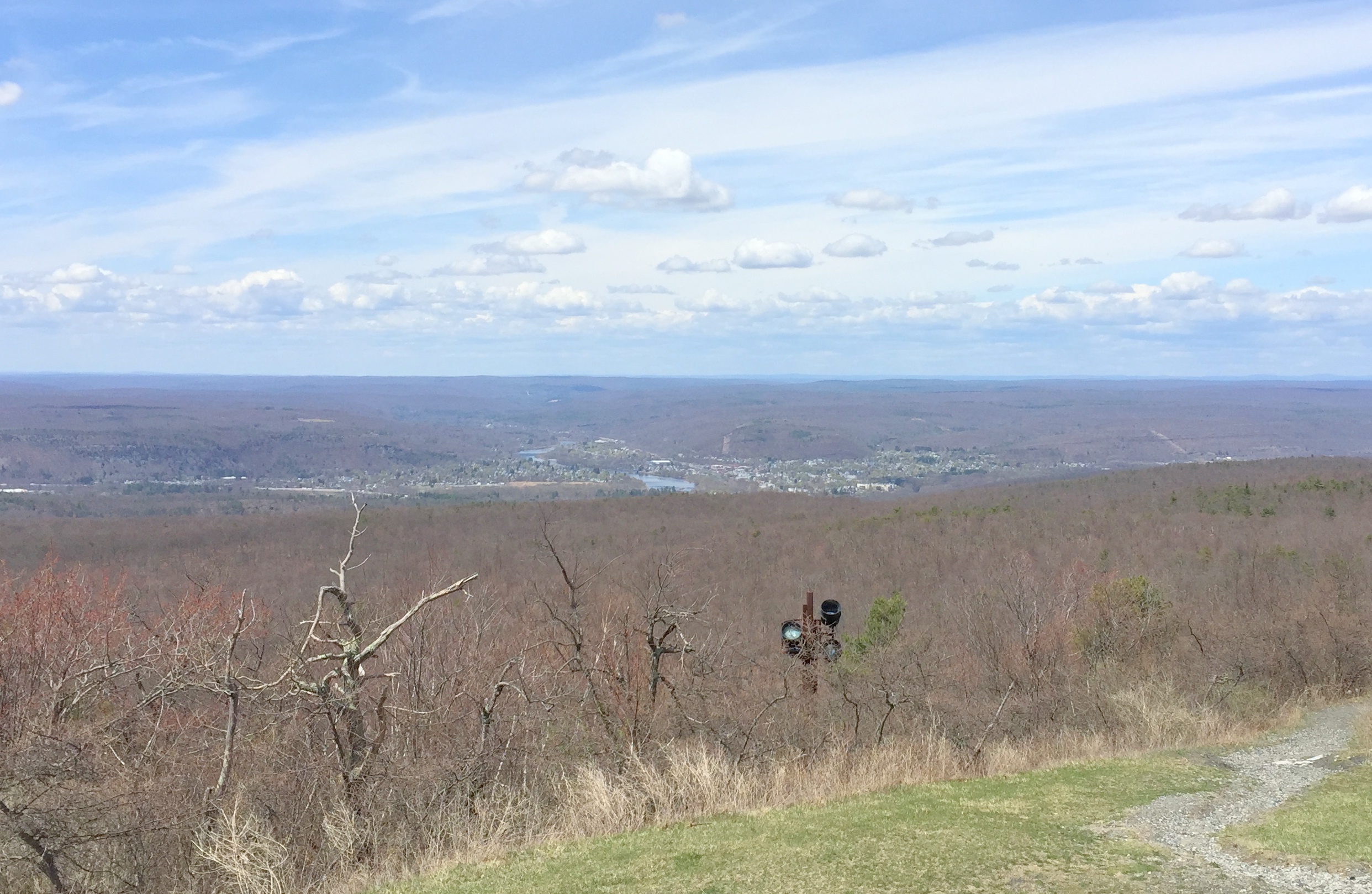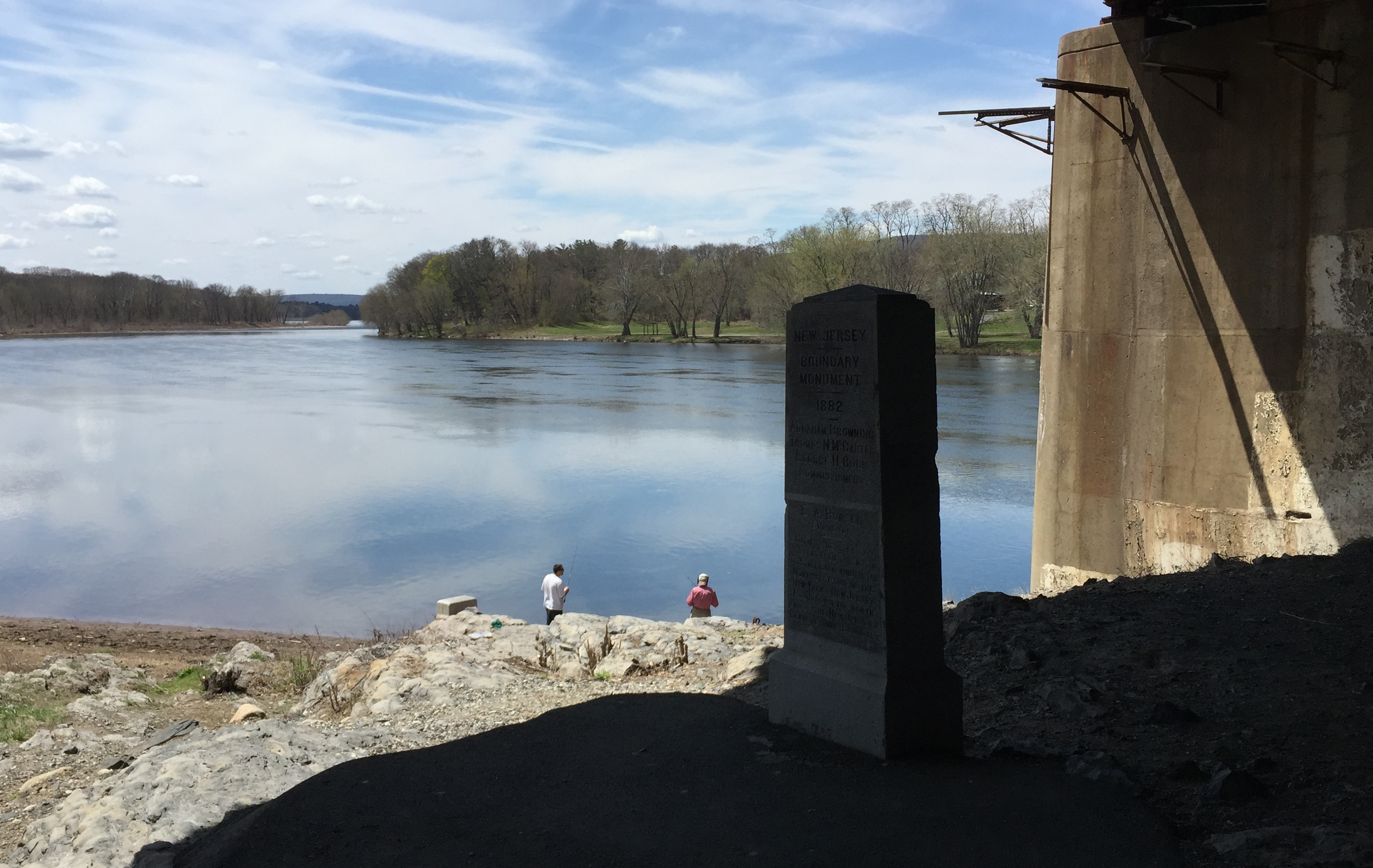 The controversial monument has been removed and a plaque explains: The Milford Sheriff’s Office has a fish over it. The Delaware Aqueduct, built in 1848, the oldest existing wire cable suspension bridge in the United States, crosses the Delaware River from Lackawaxen, PA to Minisink Ford, NY. It was originally built to carry canal boats over the Delaware River. Now the canal is gone. The National Park Service has repaired and restored and reconstructed the aqueduct, now a motor vehicle bridge. German-born engineer John A Roebling designed it and then used similar technology to build the Brooklyn Bridge in New York. We drove back to Milford, PA, on the New York side of the Delaware River along the Upper Delaware Scenic Byway. Underneath Interstate Highway 84 at Port Jervis, New York, is a Tri-States Monument. We had to drive through a cemetery to get to it, but we found it without too much trouble. Directly under the bridge is a taller monument indicating the New Jersey State Line on one side of it, and the New York State Line on the other side of it. But down by the water, by those two fishermen, is the smaller New York/New Jersey/Pennsylvania Monument. It was probably a big deal at one time, but seems no so much any more. Our last stop was out to High Point State Park, in New Jersey. Resembling the Washington Monument in Washington DC, the monument here was built in 1930 as a war memorial and is only 220 feet tall. It stands at the highest point in the State of New Jersey. All the buildings in the state park are locked up for the winter right now, and won’t be open until the end of May so we were not able to enter the monument and walk up the steps to the observation windows at the top. Oh darn.