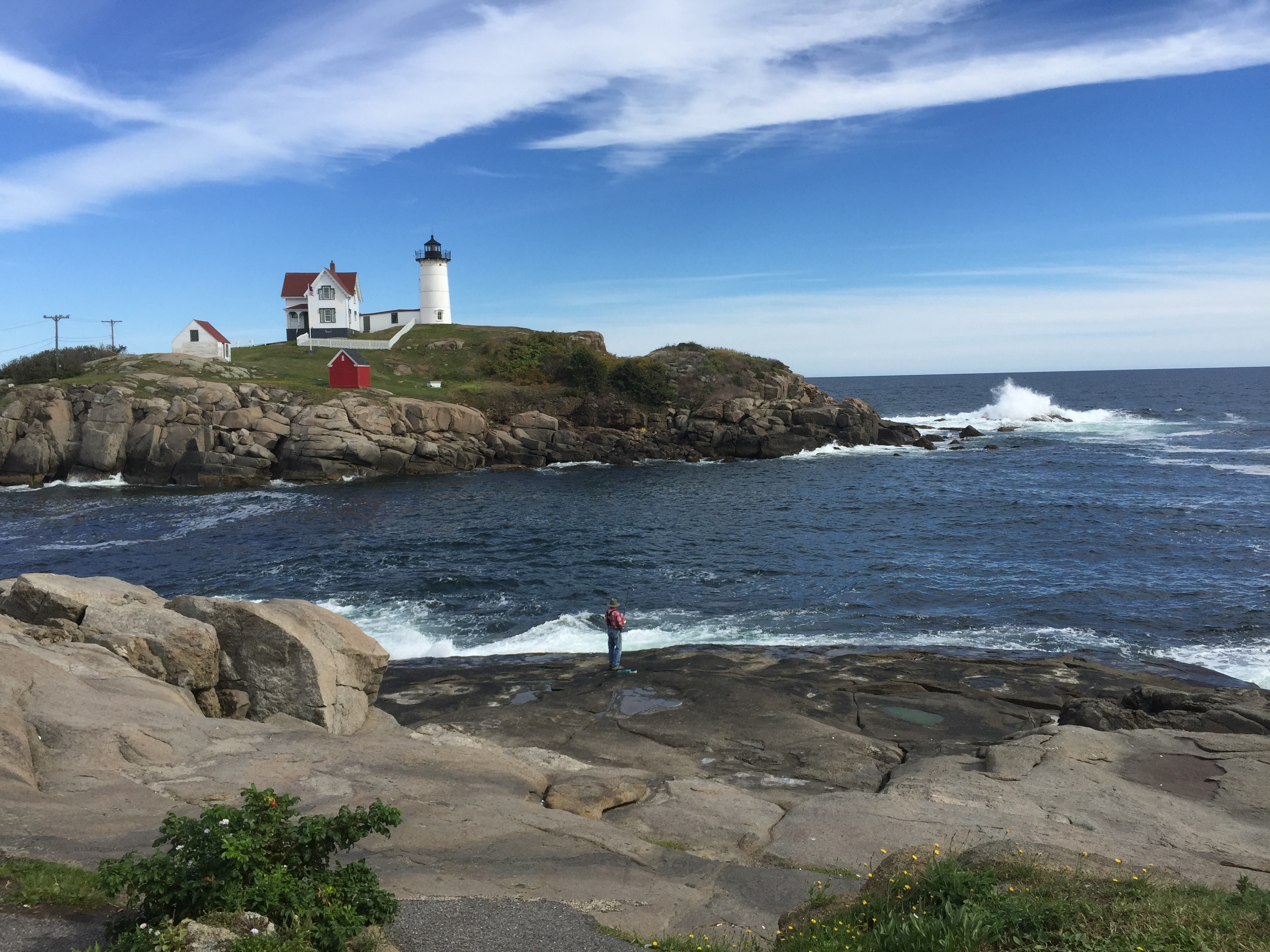 The beautiful Cape Neddick Light Station (Nubble Light) is a poplar spot. The small parking lot fills up and cars circle while waiting for someone to leave. And then a bus brings in more people. The lighthouse is not open to visitors, rather we just have to look at it from afar. Some people were fishing, some just hanging out on the rocks enjoying the view.