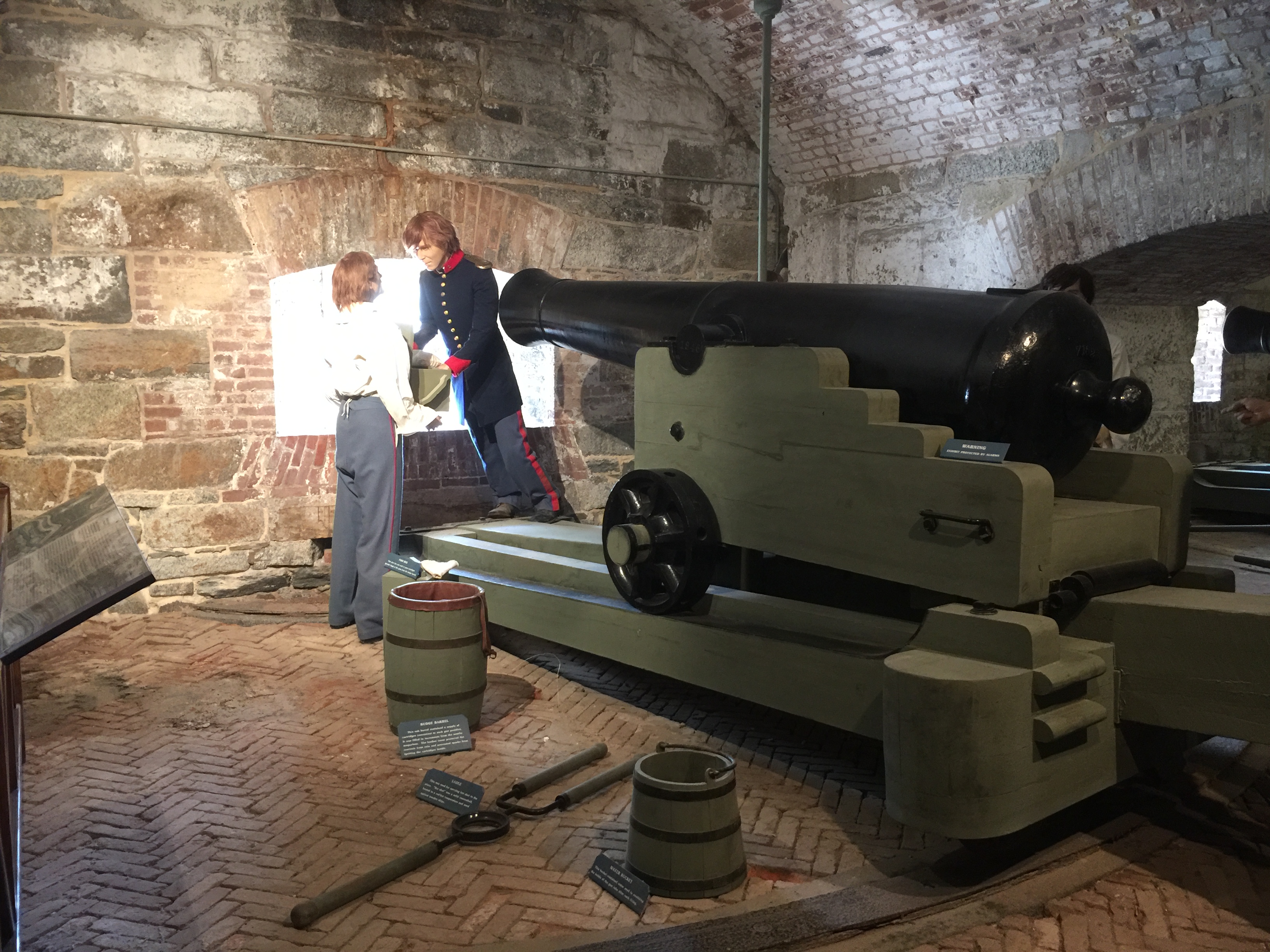 Jefferson Davis, President of the Confederate States, was imprisoned here following the end of the Civil War. Initially, his cell was in a room called a casemate, a vaulted bombproof room of masonry construction within the wall of a fort. After a few months, as his health declined, he was moved to better quarters within the fort.