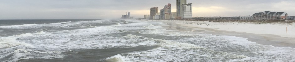The weather is definitely changing. Our weather app says it’s 68F here today but with the humidity and the winds it felt cold. So, what to do? A movie sounds good, so we met Lois at the The Wharf and went to see The Revenant. After that Lois returned to her condo, but we wanted to see what was happening at the beach so we stopped at the Gulf State Park Pier before going home. The wind was keeping the flags flying strong. The US Flag was flying at half-staff in honor of Nancy Reagan. The Alabama State Flag was flying at half-staff for, I assume, long-time Gulf State Park Superintendent, Hugh S Banyon, who passed away a few days ago. The red and purple flags are high-hazard beach warning flags.