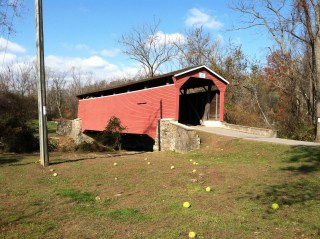 It rained last night, but was really no big deal. Today we drove out of the park and around the northeast corner of Maryland. We found this covered bridge and stopped for pictures. On the ground around the bridge were Hedge-Apples. You may have seen these in grocery stores, do not eat, they are supposed to repel spiders and other insects. There was a tree nearby that they had fallen off. I wasn’t sure what they were so I spent some time Googling. They grow on an Osage Orange tree. There were several of them in that area.